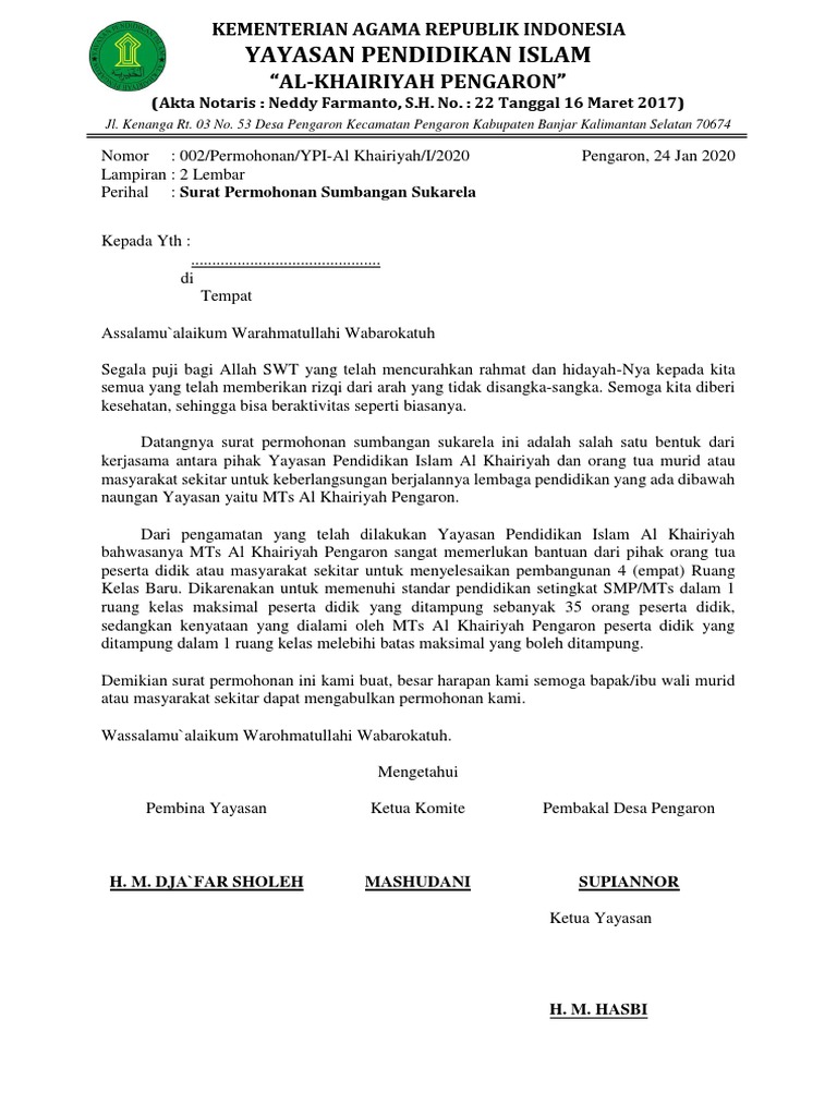 Bisa mengajukan proposal permohonan dana sumbangan secara sukarela. Atas perhatian Bapak saya ucapkan terima kasih. Yuk lihat surat sumbangan sukarela.